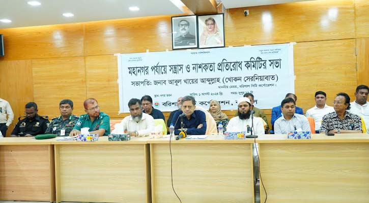 বরিশাল মহানগর পর্যায়ে সন্ত্রাস ও নাশকতা প্রতিরোধ কমিটির সভা হয়েছে। বরিশাল সিটি করপোরেশনের আয়োজনে বৃহস্পতিবার (১ আগস্ট) দুপুর ১২টায় নগর